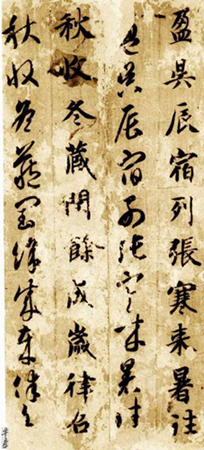 明董其昌《画禅室随笔》说他学钟繇《宣示表》,“每用笔必曲折其笔,宛转回向,沉著收束,所谓当其下笔欲透纸背者”。他所写的《千字文》清何绍基说:“笔笔从空中来,从空中住,虽屋漏痕,犹不足以喻之”。我们细读他的墨迹《千字文》,看得出他用笔上藏头护尾,一波三折,含蓄而有韵律的意趣。董、何之说可谓精确、具体、恰当。